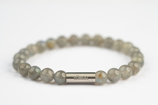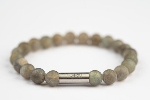 De tijdloze armband is gemaakt van edelstenen in mat grijs-groene labradoriet met soms een blauwe of groenige glans en is afgewerkt met een RVS kraal.